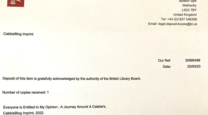 Recently a letter was dropped on my doormat, addressed to CabbieBlog Imprint. The missive informed me that Everyone Is Entitled To My Opinion has been accepted by the British Library.