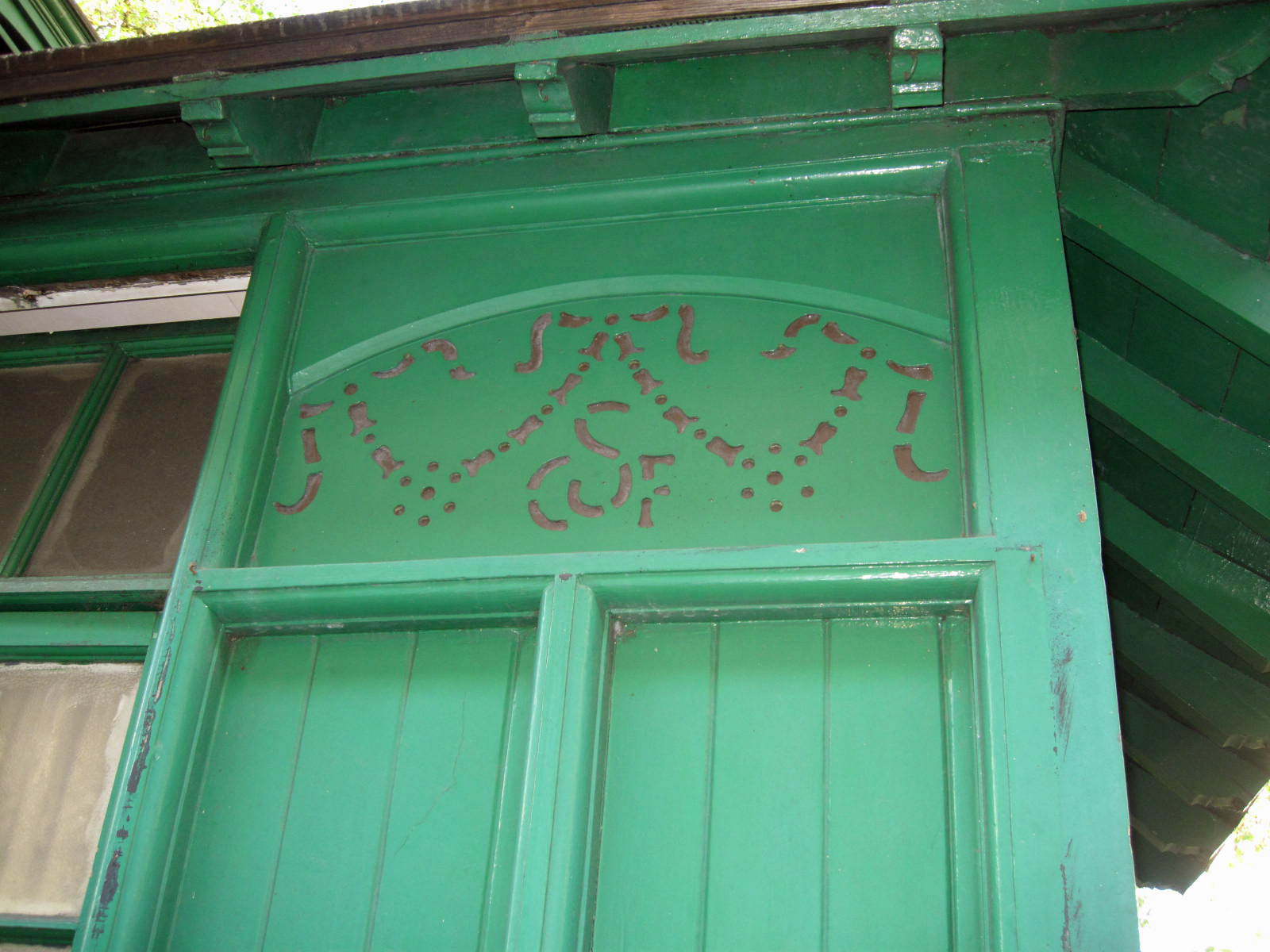 The upper panels between the windows are decorated with a pattern of holes that include a monogram CSF, standing for Cabmen Shelter Fund, which most shelters have. However, some shelters have either glass or wood in the top panels instead. The whole shelter is painted the distinctive Dulux Buckingham Paradise 1 Green.